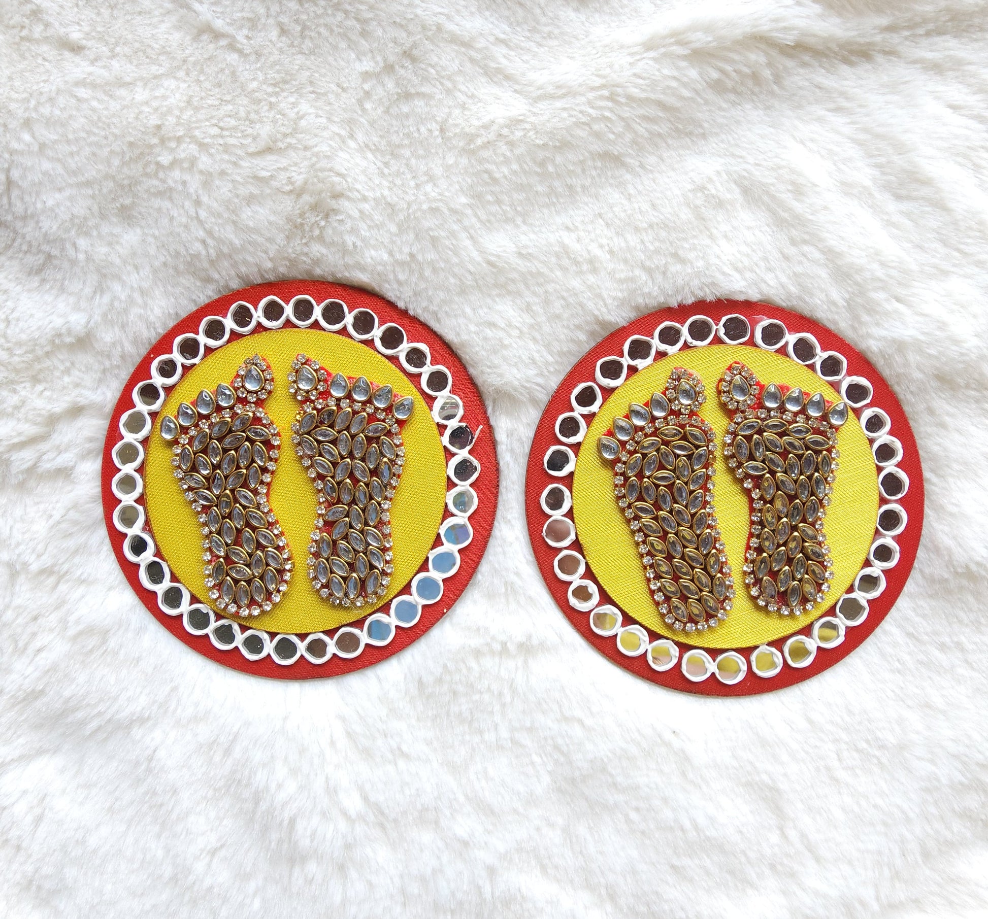 Sacred Laxmi Charan footprints designed to welcome Goddess Laxmi into your home. Handcrafted with detailed work, perfect for Diwali and poojas. Place them at the entrance or mandir for blessings. A simple yet divine décor piece.