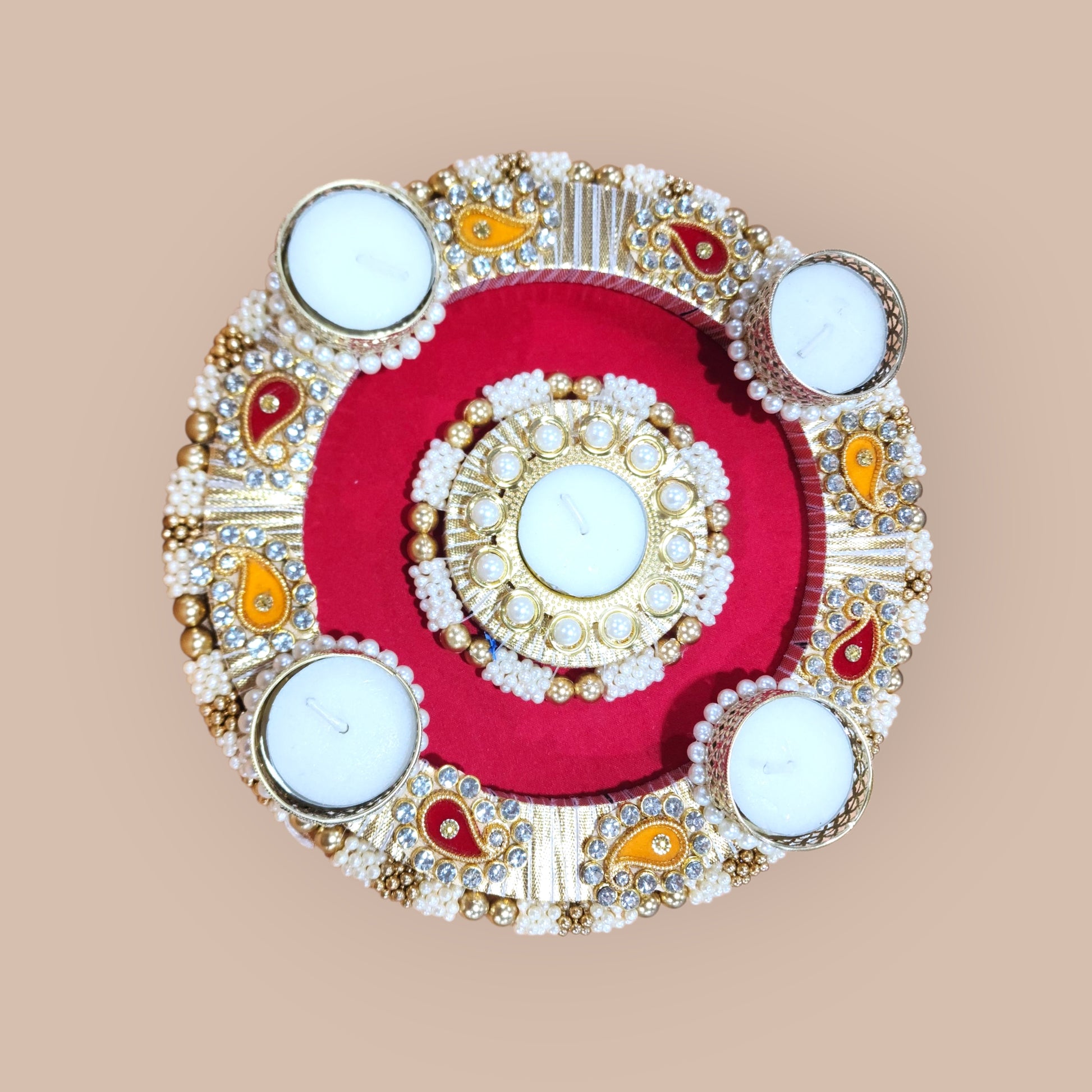 A festive rangoli mat with attached diyas to brighten up your space. Easy to place at the entrance, pooja room, or balcony. Adds instant festive vibes without the hassle of making rangoli. Reusable and elegant for all occasions.